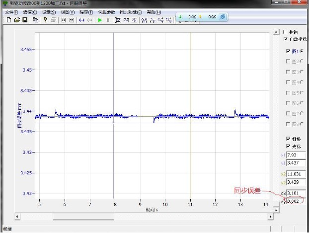 按照以上公式先调整Z轴与C轴的位置比例增益参数,使同步误差达到最小的状态,如下所示: