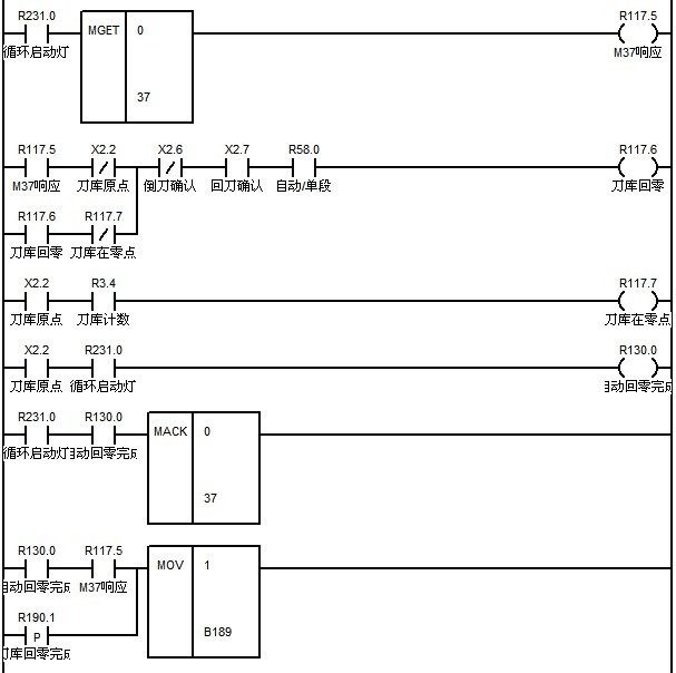 M37:刀库正转,直到碰到刀库原点信号停止转动。设置该时刻的刀位号为1号刀位。