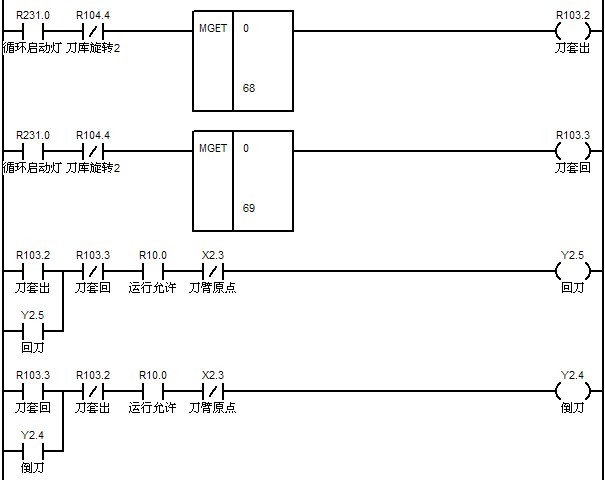 M34的实现与M33类似,通过检查F寄存器0组第8,9,10,11位可以检查预设定的机床第二,三,四,五参考点。另外也可以根据需要写出相似的代码用来检查每个运动轴的参考点。