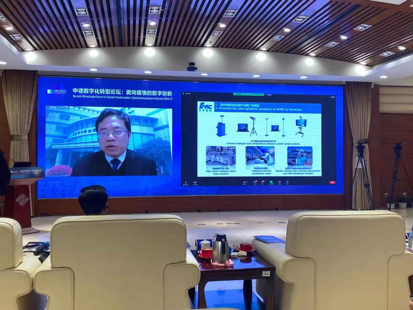 陈吉红董事长作了题为“数字抗疫 智造未来”的报告,介绍了华中数控的基本情况,特别是在这次新冠疫情中,华中数控发挥科技优势,数字抗疫复工复产取得的成效。陈吉红董事长重点介绍了华中数控抗疫系列产品:红外智能体温检测设备、高速智能平面口罩机、具备红外测温和消毒功能的电动车等产品的技术特点和推广应用情况,并对今后中德数字化合作提出了建设性意见,希望以此为契机将华中数控的抗疫产品推广到德国;与德国高校、企业、科研院所开展数控机床、智能智造、智能工厂建设的合作与交流,为中德数字伙伴关系建设做出贡献。