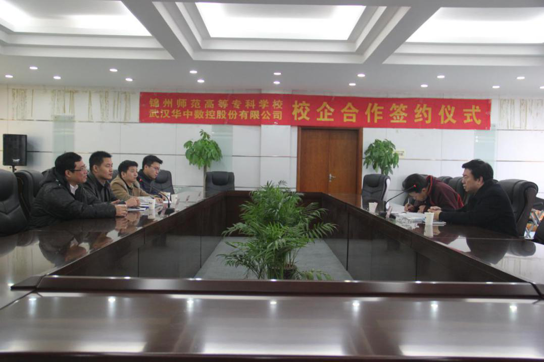 2016年1月8日,锦州师范高等专科学院的毛玖学院长一行来我司考察、洽谈校企合作事宜,华中数控董事长陈吉红亲切接待了毛玖学院长,双方就深化校企合作关系,实现深度合作达成一致,并且签订了相关项目合作协议。