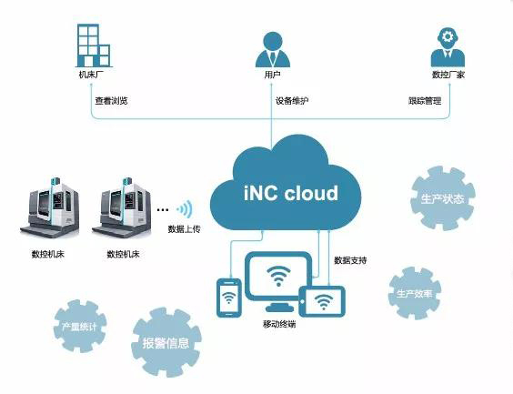 华中数控iNC-Cloud在工业互联网、大数据、云计算、新一代人工智能技术的基础上,建立安全可靠、高效智能的云数据中心,通过大数据智能分析、数据统计、数据可视化等技术,实现生产过程的智能监控、维护与管理。用户可以通过移动终端,随时了解设备的生产状态、生产效率、产量统计、报警信息等,享受专业、智能、安全的跟踪服务,分享制造过程中生产管理、设备维护等先进经验,从而提高企业的核心竞争能力。
