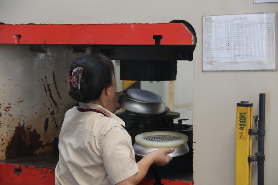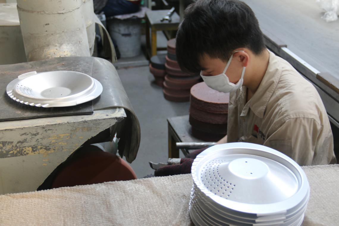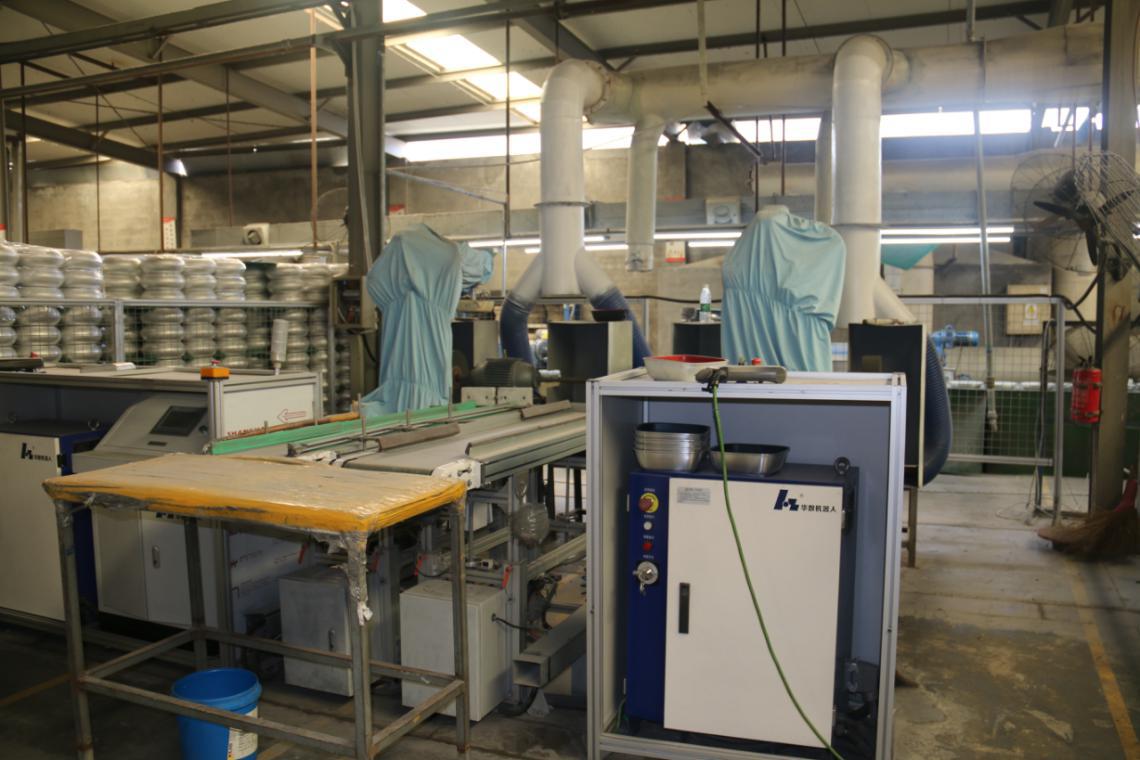 锅具打磨以前是靠工人一件件的手工打磨,粉尘多,噪音高,劳动环境非常恶劣,你看那位坐在角落里的小哥哥了吗,他正在给锅具打磨,给他点赞,但同时也替他担心。