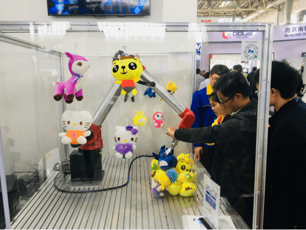 展出的人机互动“抓娃娃”机器人吸引了大批观众的参与体验