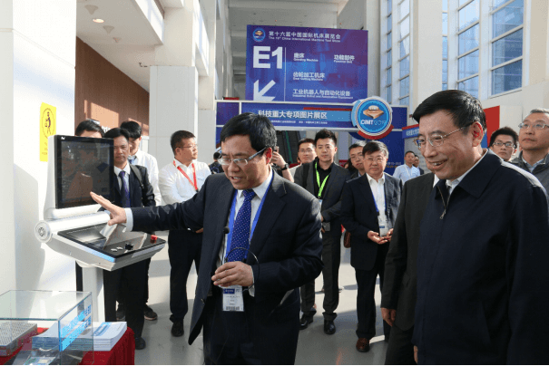 陈吉红董事长向中国机械工业联合会王瑞祥会长、中国机床工具工业协会常务副理事长毛予锋、中国工程院原院长周济院士等来访贵宾介绍华中数控最新产品及技术