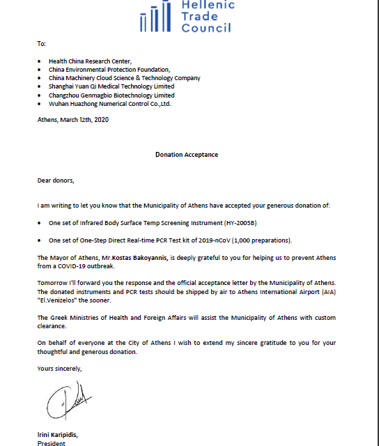 当前,新冠肺炎疫情正在全球多个国家蔓延扩散。截止3月20日,希腊共和国累计确诊新冠肺炎病例增加到近500例。面对新冠疫情快速蔓延,希腊共和国总理米佐塔基斯称“希腊处于战争状态,但我们必将获胜”。他强调当前希腊政府的首要任务是“挽救生命”,希腊共和国政府已经出台一系列措施进行防疫抗疫。3月20日,在中华环境保护基金会的协调下,yl7703永利集团(简称华中数控)通过希腊共和国驻中华人民共和国大使馆,向希腊共和国捐赠一台HY-2005B红外智能测温仪,支援希腊共和国政府开展防疫抗疫工作。为此,雅典市市长专门发来感谢信,感谢华中数控为希腊疫情防控提供帮助,据悉,本次捐赠的红外智能测温仪将用于雅典国际机场海关旅客的体温检测。