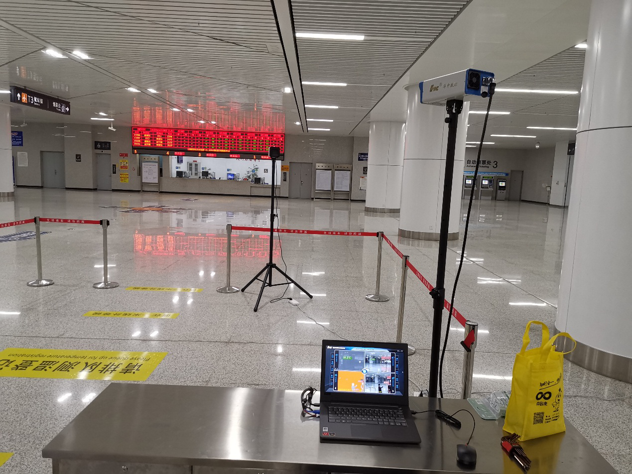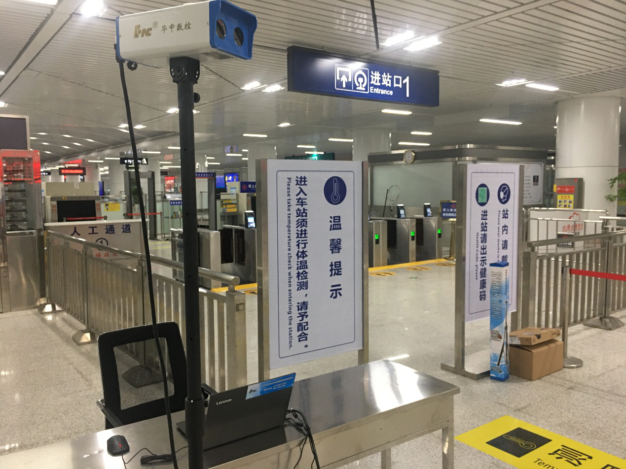 武汉华中数股份有限公司数控系统事业部程强、胡跃等负责设备的现场安装调试,据介绍,华中数控的红外智能体温检测设备是集先进的光电子技术、热成像技术、图像处理技术和控制技术于一体的高科技产品。该系统核心元件是进口的非制冷焦平面探测器,温度分辨率可达到0.05℃,寿命可达 5 万小时。安装在车站后,可以满足车站安检“非接触式”的测温和安检需求,旅客不需要摘下帽子和口罩,依次进入测温通道;不需要身体接触,远距离6-8米被测量体温;不会遭受拥堵,快速测温响应时间仅需1秒;有黑体作参照标准,不会测量出错,可实时将测温结果直观反馈在显示屏上。若遇到可疑发热病人,设备会立即报警,不仅大幅提高地铁安检工作效率,大大降低安检人员与被检人员交叉感染的可能性,有效缓解人流密集场所安检压力。