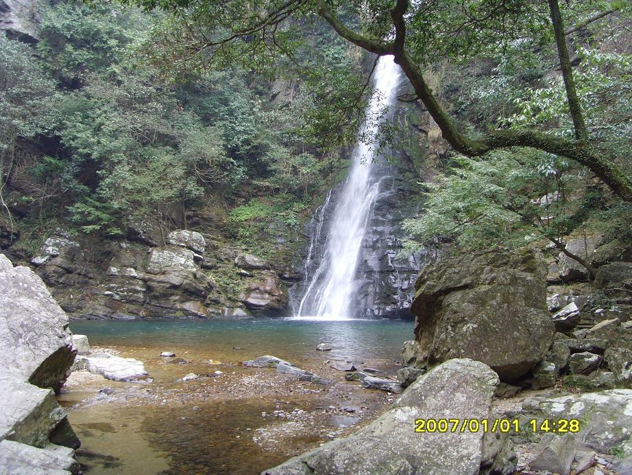 从黄洋界下山,我们慕名来到久负盛名的龙潭瀑布群,亦称“五龙潭”,这是井冈自然风景最为壮观佳绮丽的地区之一。五龙潭共有五潭五瀑,从上到下第一潭名碧玉潭,潭上有碧玉瀑,上窄下宽,凌空飞泻,落差达67米,是五瀑中最高的一个,下落深潭,潭水碧绿,清澈晶莹,犹似碧玉。第二潭名金锁潭,潭上有锁龙瀑,古名黄龙瀑。第三潭名珍珠潭,潭上有珍珠瀑,瀑水从30米高的陡崖上飞下,中间遇一巨石阻击,水花飞溅,如喷珠吐玉。第四潭名飞凤潭,潭上有飞凤瀑急流直下,如凤凰展翅,飞入潭中。第五潭名玉女潭,潭上有玉女瀑,似一窈窕少女,正在翩翩起舞,真是惟妙惟肖。再往下有红军洞,洞内能容百余人,在当年反围剿斗争中,曾住过红军伤病员,今遗迹仍在。